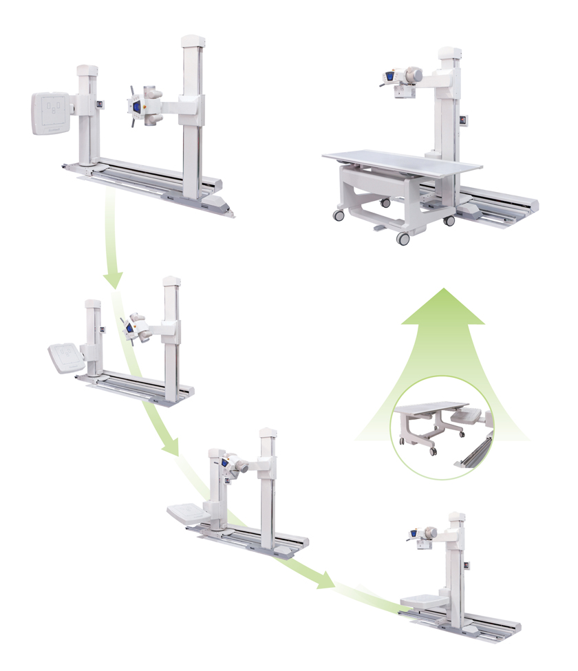Motorized DR stand will support smooth and easy exam positions without table movement – The detector assembly with bucky will travel based on the programmed traveling route without any crush onto top of table.