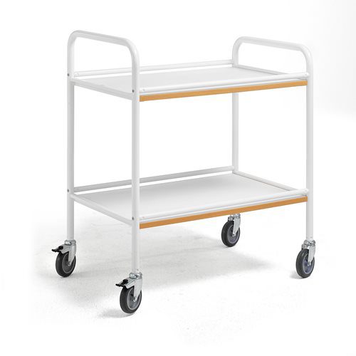 Epoxy powder coated tubular frame and epoxy coated sheet steel shelves. 4 x 75mm swivel castors.
